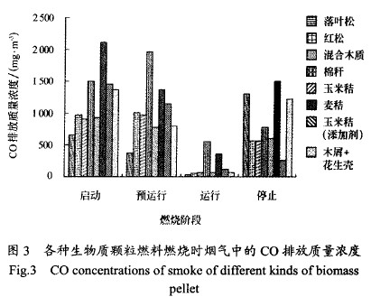燃燒器正常運(yùn)行時(shí),8種生物質(zhì)顆粒燃料的CO排放質(zhì)量濃度由低到高依次為:落葉松、紅松、玉米秸、木屑+花生殼、玉米秸(含添加劑)、混合木質(zhì)、麥秸、棉稈,其排放質(zhì)量濃度分別為29.18、51.19、59.06、63.09、65.25、120.00、365.94、555.37mg/m。由此可見,其中麥秸和棉稈的CO排放質(zhì)量濃度較高,這可能是因?yàn)椴煌镔|(zhì)顆粒燃料的c、H、0元素的含量不同,其所需的理論空氣量也不同,而燃燒器的風(fēng)量是一定的,造成了過量空氣系數(shù)的不匹配。