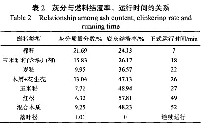 生物質(zhì)顆粒的灰分含量對(duì)燃燒器的正常運(yùn)行時(shí)間有顯著影響,見表2。如果顆粒燃料的灰分含量過大,會(huì)導(dǎo)致燃燒器因無法及時(shí)排出灰分而難以持續(xù)運(yùn)行,如棉稈的灰分質(zhì)量分?jǐn)?shù)最高(21.69%),而底灰結(jié)渣率很低(24.13%),但其正式運(yùn)行時(shí)間最短(僅為7min),同樣的情形可見玉米秸稈(含添加劑)等。此外,底灰結(jié)渣率對(duì)燃燒器的正常運(yùn)行時(shí)間也有較大影響,如紅松、玉米秸,雖然其灰分含量較低(僅為6.32%、7.71%),但結(jié)渣率達(dá)到57.81%、48.94%,嚴(yán)重的結(jié)渣造成了燃燒器的檢測孔被堵,從而導(dǎo)致燃燒器受控停止,不能實(shí)現(xiàn)連續(xù)運(yùn)行??梢妵獾娜紵鞑⒉贿m合中國,需要進(jìn)行改造,否則難以連續(xù)運(yùn)行。同時(shí),我們還可以看出,生物質(zhì)顆粒的灰分含量對(duì)燃料的結(jié)渣基本上沒有趨勢性影響。