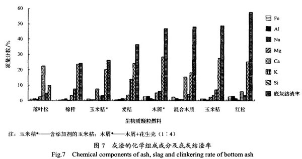 生物質(zhì)顆粒燃料的底灰結(jié)渣率與其化學(xué)組成密切相關(guān),見圖7,圖中所示燃料的結(jié)渣率為依次增大。一般來說,燃料中Si元素含量越高,結(jié)渣趨勢越明顯,如木屑+花生殼、玉米秸、紅松、以及麥秸等,其si的質(zhì)量分?jǐn)?shù)基本在25%左右或更高,結(jié)渣率較高;反之,落葉松灰渣中的化學(xué)成分中si的質(zhì)量分?jǐn)?shù)最低,僅為9.76%,其結(jié)渣率也最低(不結(jié)渣)。