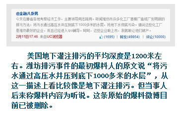 實際上地下灌注排污成本非常高,據(jù)美國杜邦公司的介紹,一次性投資在幾千萬美元以上。目前在東營等地有與美國公司合作的項目在逐步投入應(yīng)用,但似乎沒有公開資料表明濰坊也有相關(guān)項目。