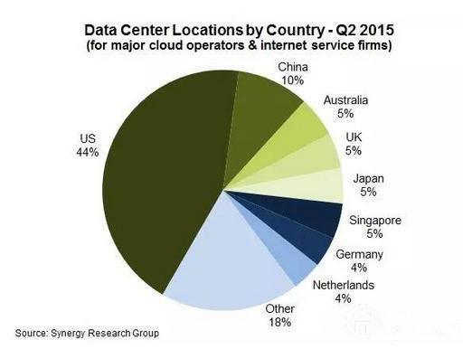 毫無疑問,是美國。雖然SynergyResearchGroup的報告以中美兩國共占54%為標(biāo)題,但實際上,擁有亞馬遜、谷歌、微軟、Rackspace、IBM這些巨頭的美國,在本土建設(shè)了占據(jù)全球44%的云數(shù)據(jù)中心!而中國只占10%,這個數(shù)量排行的另外的20%由分占5%的四個國家組成:英國、澳大利亞、日本和新加坡,德國和荷蘭以4%位列其后。剩余18%則分布在各種各樣的“其他”的地方,這些地方占據(jù)重要的樞紐位置以至可以容納諸多服務(wù)提供商前來建設(shè)數(shù)據(jù)中心,比如都柏林、阿姆斯特丹、和香港。