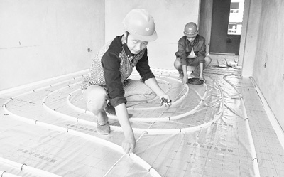 河南油田職工住房按新型節(jié)能建筑標(biāo)準(zhǔn)設(shè)計,油田以中低溫地?zé)豳Y源作為熱源,采取地?zé)崴g接供熱與地源熱泵相結(jié)合的地?zé)崽菁壚眉夹g(shù),取代燃料鍋爐供熱。與暖氣片采暖方式相比,地板采暖,年可節(jié)約煤約9萬噸,年節(jié)約電800萬千瓦時,達(dá)到節(jié)能降耗、低碳減排的目的。圖為施工人員正在鋪設(shè)室內(nèi)地?zé)峁芫€。