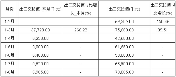 2015年1-8月中國污水處理及其再生利用出口交貨值統(tǒng)計表