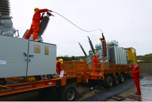 圖為工作人員在調(diào)試110千伏移動(dòng)式變電站。