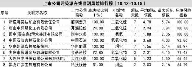 今日發(fā)布的“上市公司污染源在線監(jiān)測(cè)風(fēng)險(xiǎn)排行榜”(以下簡稱“環(huán)保榜”)顯示,10月12日至18日的監(jiān)測(cè)期內(nèi)共計(jì)17家企業(yè)上榜。除新疆昕昊達(dá)礦業(yè)有限責(zé)任公司仍然固守第一以外。唐山中潤煤化工有限公司和國中(秦皇島)污水處理有限公司分別位列二、三,且三家企業(yè)均為每日超標(biāo)排放。