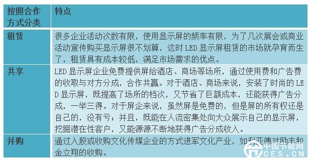 一方面,從合作方式來看,LED屏運營新模式主要有租賃、共享、并購等類型。