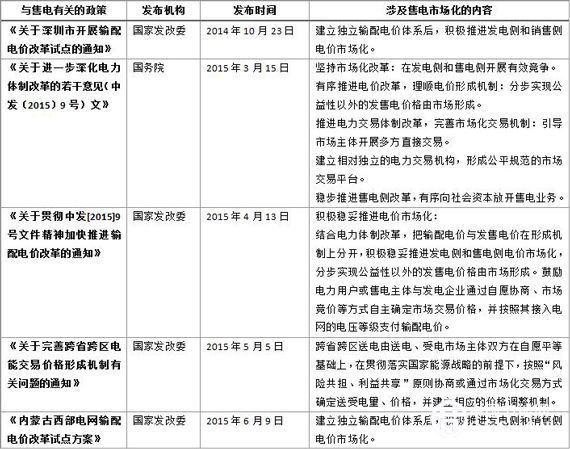 我們認(rèn)為雖然上述與售電相關(guān)的政策均提出要推進(jìn)售電側(cè)電價市場化;雖然上述政策提出允許符合條件的高新產(chǎn)業(yè)園區(qū)或經(jīng)濟(jì)技術(shù)開發(fā)區(qū)、社會資本、分布式電源的用戶或微網(wǎng)系統(tǒng)、公共服務(wù)行業(yè)和節(jié)能服務(wù)公司以及發(fā)電企業(yè)投資和組建售電主體進(jìn)入售電市場,從事售電業(yè)務(wù);雖然深圳、寧夏、蒙西、云南和貴州輸配電價改革試點方案已獲得國家發(fā)改委的批復(fù),但是電力交易市場怎樣建立、具體的交易機制是怎樣的、售電主體的準(zhǔn)入機制等問題的解決仍需等待相關(guān)配套政策的出臺。