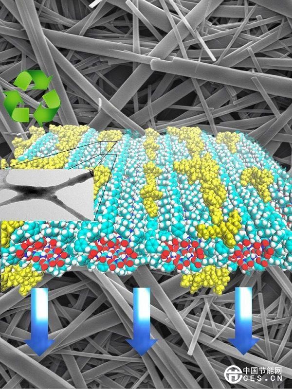 圖中顯示肽納米管上聚合物分布的模擬圖,以及納米復(fù)合材料的電子顯微影像