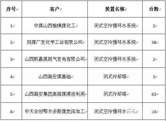 目前湖北中圣股份設(shè)計并生產(chǎn)的閉式空冷循環(huán)冷卻水系統(tǒng)在冶金、石化、電力及化工領(lǐng)域已廣泛應用,在煤化工領(lǐng)域也有不少成功應用的案例,部分業(yè)績表見下表。