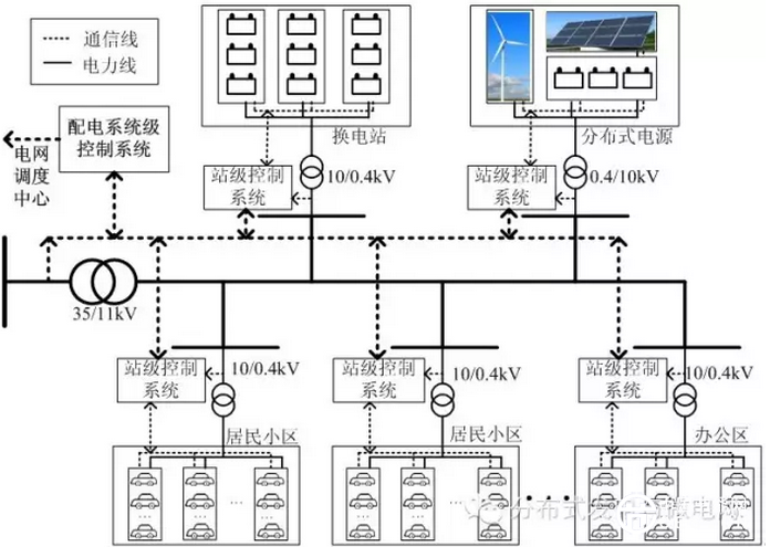 電動(dòng)汽車(chē)和分布式電源是未來(lái)智能配電網(wǎng)中必不可少的負(fù)荷和電源,如何對(duì)這些元件進(jìn)行合理的調(diào)度是一個(gè)至關(guān)重要的研究課題。鑒于上述研究中的不足及研究思路,本文提出一種分層有序充電控制架構(gòu),在配電網(wǎng)建立兩層控制系統(tǒng):配電系統(tǒng)控制系統(tǒng)和站級(jí)控制系統(tǒng),給出了相應(yīng)的控制模型,能夠在與傳統(tǒng)電網(wǎng)控制架構(gòu)融合的基礎(chǔ)上,實(shí)現(xiàn)配電網(wǎng)范圍內(nèi)電動(dòng)汽車(chē)與分布式可再生電源的協(xié)同有序控制。