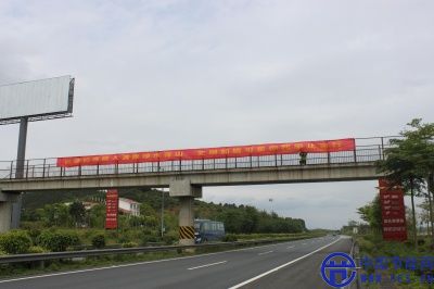 百色路政支隊在高速公路上跨天橋懸掛文明出行宣傳橫幅。