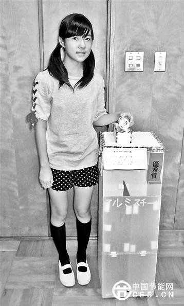 這名年僅12歲的女生名叫神谷明日香,她設(shè)計(jì)的可分類垃圾桶高約90厘米、呈長(zhǎng)方體,由塑料板制作而成,內(nèi)部設(shè)有隔間,分別盛放鐵制和鋁制易拉罐。整個(gè)箱子的投放口設(shè)置在鋁制易拉罐回收桶的上方,磁鐵被放置在投放口的對(duì)側(cè),鐵質(zhì)易拉罐回收桶的上方。當(dāng)投入鋁罐時(shí),磁性原理不起作用,罐子會(huì)直接落入鋁罐回收桶內(nèi),當(dāng)投入鐵罐時(shí),磁鐵發(fā)揮作用,將罐子吸入對(duì)側(cè)的鐵罐回收桶內(nèi),整個(gè)回收過(guò)程相當(dāng)便捷高效。