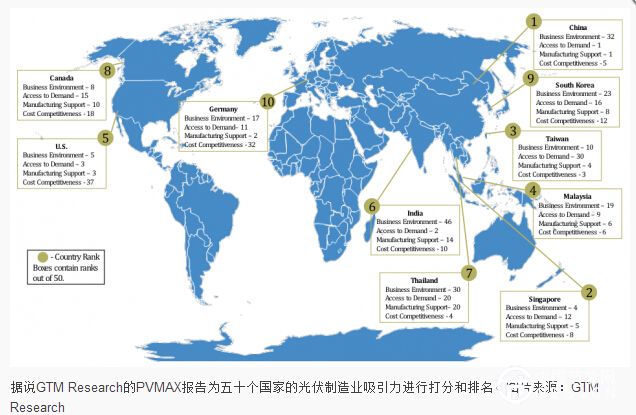 GTM表示,其PVMAX報告基于四個類別二十五個不同標準為五十個國家的光伏制造業(yè)吸引力進行打分和排名,四個類別為:商業(yè)環(huán)境、需求、光伏制造業(yè)的支持以及總成本。