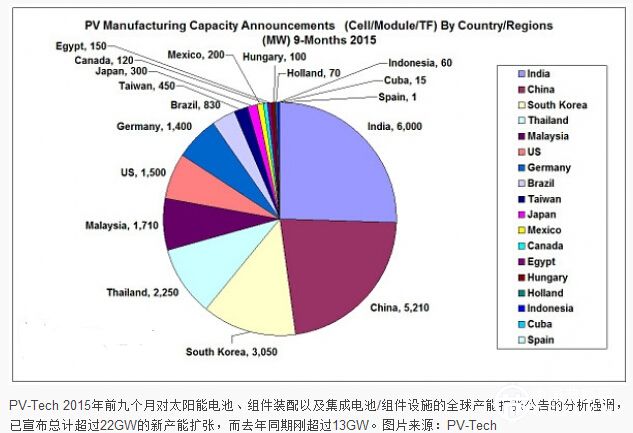 PV-Tech 2015年前九個月自己對太陽能電池、組件裝配以及集成電池/組件設(shè)施的全球產(chǎn)能擴張公告的分析強調(diào),已宣布總計超過22GW的新產(chǎn)能擴張,而去年同期剛超過13GW。