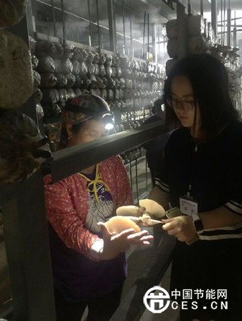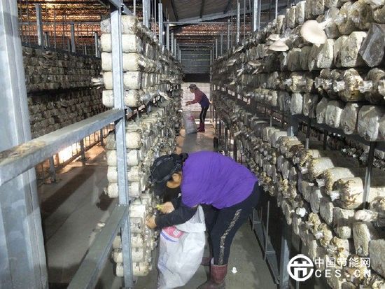 圖為晁陽員工在光伏大棚采摘蘑菇