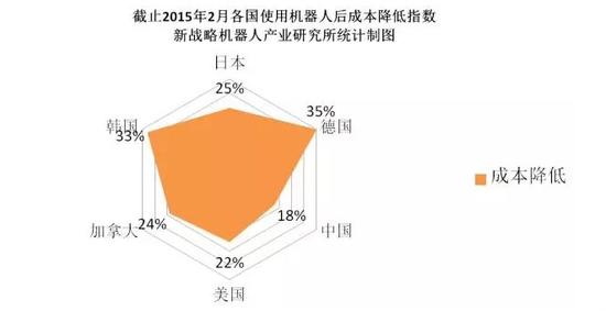 這是美國波士頓公司在今年2月10日發(fā)布的最新報告,他們對前兩年全世界各個國家機器人應(yīng)用做了一個統(tǒng)計,發(fā)現(xiàn)大量使用機器人后制造業(yè)成本大幅下降,韓國的成本降低了33%,日本降低了25%,加拿大降低了24%,美國和中國臺灣降低了22%,中國降低了18%,這些都是平均水平。同時他們對今后十年也做了一個預(yù)測,機器人給制造業(yè)產(chǎn)業(yè)帶來的成本降低是16%,中國綜合成本最大的只差10%,也就是說,未來中國的制造成本優(yōu)勢將不復存在,制造業(yè)大國的地位也將一去不復返。