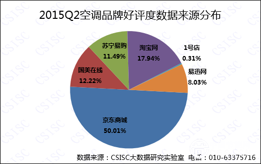 2015年第二季度空調(diào)行業(yè)采集主要品牌產(chǎn)品好評(píng)度的數(shù)據(jù)主要來(lái)自于淘寶網(wǎng)、京東商城、國(guó)美在線、蘇寧易購(gòu)、易迅網(wǎng)、1號(hào)店六大電商平臺(tái)。其中,好評(píng)度主要分布在京東商城,占總體的50.01%;1號(hào)店分布最少,僅0.31%。