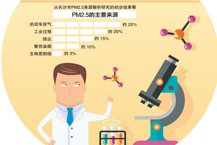 特護(hù)期內(nèi),長(zhǎng)沙市絕大部分時(shí)間的空氣首要污染物為PM2.5。PM2.5是造成霧霾的主要原因,而從長(zhǎng)沙市PM2.5來(lái)源解析研究的初步結(jié)果看,機(jī)動(dòng)車排氣(約占25%)、工業(yè)過(guò)程(約占20%)、揚(yáng)塵(約占15%)、餐飲油煙(約占10%)、生物質(zhì)燃燒(約占3%)是PM2.5的主要來(lái)源。