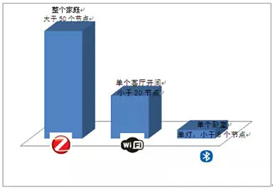 具體到家居互聯(lián)照明協(xié)議,Zigbee適用于整個家庭多個照明燈具互聯(lián)情況,比如多個燈具,開關(guān),遙控互聯(lián),其支持的節(jié)點多,需要組網(wǎng),還要求低成本,低功耗。Wi-Fi可以對客廳中單個或少個燈具進行控制,其在不考慮功耗,還提供音響,視頻監(jiān)控等綜合功能的高價格的吊燈上使用。藍牙可以用在臥室單個燈具比如床頭燈,落地燈等少量燈具間互聯(lián)操作情況。協(xié)議選擇應(yīng)用如圖1所示。
