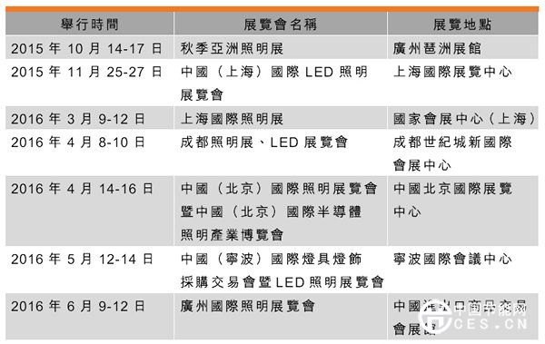 5、傳統(tǒng)電商模式近年受到照明電器企業(yè)的青睞作為新的銷(xiāo)售渠道。部分品牌沒(méi)有十分完善的銷(xiāo)售體系,會(huì)較多選擇網(wǎng)絡(luò)的渠道去找尋新商機(jī),不少新興企業(yè)在網(wǎng)絡(luò)銷(xiāo)售上已占了一個(gè)有利的位置?,F(xiàn)在O2O電商模式也在照明電器市場(chǎng)開(kāi)始流行,消費(fèi)者線上購(gòu)買(mǎi),然后在實(shí)體店線下體驗(yàn)。根據(jù)市場(chǎng)數(shù)據(jù)顯示,2014年網(wǎng)購(gòu)照明產(chǎn)品市場(chǎng)規(guī)模約達(dá)146.8億元,在所有銷(xiāo)售管道中約占14.4%。由于傳統(tǒng)企業(yè)有不少實(shí)體銷(xiāo)售店,可以提供線下體驗(yàn),相對(duì)地比單純線上企業(yè)去從事O2O更有優(yōu)勢(shì)。開(kāi)啟O2O模式的企業(yè)有翰源、萊威光電等,而雷士照明的「雷士O2O商城」,史福特的「E燈快線」等亦相繼加入O2O模式,這渠道將會(huì)是照明電器行業(yè)銷(xiāo)售發(fā)展的趨勢(shì)。6、2015-2016內(nèi)地部分燈具燈飾展覽會(huì):