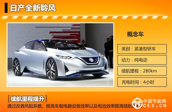 日產(chǎn)全新純電動(dòng)車(chē)型——聆風(fēng)的外觀和上代車(chē)型差異不大,較為明顯的是輪轂造型的改變。而新車(chē)在續(xù)航里程上的升級(jí)更加引人注目。全新聆風(fēng)有兩種續(xù)航里程版本車(chē)型供選擇,其中一款搭載了現(xiàn)款車(chē)型的24kWh電池組,可續(xù)航135km,而高配版本將會(huì)使用高容量電池組,續(xù)航里程達(dá)到280km。這主要是通過(guò)改善風(fēng)阻系數(shù)、提高車(chē)載電器設(shè)備效率以及電池效率等多種手段實(shí)現(xiàn)的。在快充模式下,全新聆風(fēng)一次充電可以在4小時(shí)內(nèi)完成,在普通充電模式下則需要8小時(shí)。