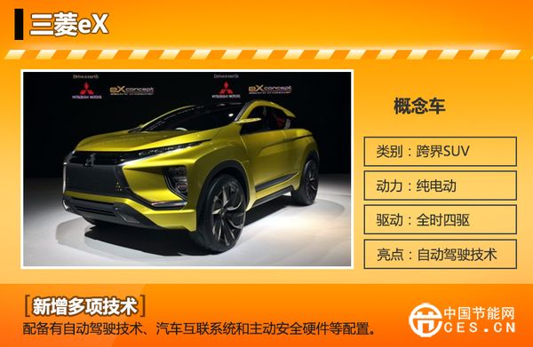 三菱eXSUV概念車(chē)在本屆東京車(chē)展中首次發(fā)布,采用純電動(dòng)驅(qū)動(dòng)系統(tǒng)并配備全時(shí)四驅(qū)系統(tǒng)。外觀方面采用三菱家族式的設(shè)計(jì)風(fēng)格,LED前大燈組造型格外犀利,前進(jìn)氣格柵采用黑色設(shè)計(jì)并搭配鍍鉻飾條修飾;車(chē)身側(cè)面采用了極具棱角的流線形設(shè)計(jì),懸浮式車(chē)頂設(shè)計(jì)看起來(lái)非常時(shí)尚。此外,尾部線條和LED尾燈組與前臉相呼應(yīng),帶來(lái)大氣而不失穩(wěn)重的視覺(jué)效果。