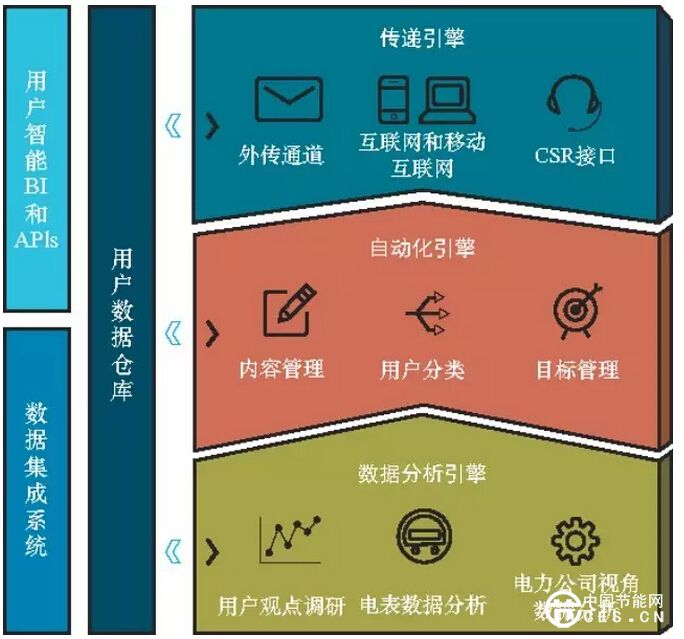 Opower的云數(shù)據(jù)平臺(tái)在集成數(shù)據(jù)倉(cāng)庫(kù)、數(shù)據(jù)聚合系統(tǒng)和用戶智能系統(tǒng)等通用系統(tǒng)基礎(chǔ)上,開(kāi)發(fā)了三個(gè)引擎:數(shù)據(jù)分析引擎、自動(dòng)化引擎和傳遞引擎,如圖1所示。其中數(shù)據(jù)分析引擎包括用戶觀點(diǎn)調(diào)研分析、用戶數(shù)據(jù)分析和電力公司視角的數(shù)據(jù)分析;自動(dòng)化引擎包括內(nèi)容管理、用戶分類和目標(biāo)管理;傳遞引擎包括外送通道、互聯(lián)網(wǎng)和移動(dòng)互聯(lián)網(wǎng)和CSR接口。