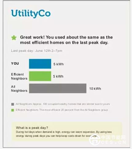 Opower在研究中體會(huì)到,平常情況下家庭用戶對(duì)用能情況是漠不關(guān)心的,如何才能促使其關(guān)心用能情況并持續(xù)參與節(jié)能活動(dòng)呢?Opower應(yīng)用行為科學(xué),基于從電力公司獲取的用戶用能數(shù)據(jù),揭示了用戶在用能方面的心理和行為:節(jié)省家庭電費(fèi)、拯救地球等道德說(shuō)教,諸如此類的激勵(lì)均不發(fā)揮作用,而鄰里之間用能的比較和競(jìng)爭(zhēng)卻有效激勵(lì)了用戶,起到了很好的效果。