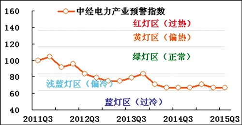 2015年三季度,中經(jīng)電力產(chǎn)業(yè)景氣指數(shù)為97.6,與上季度基本持平。中經(jīng)電力產(chǎn)業(yè)預警指數(shù)為66.7,與上季度持平,連續(xù)7個季度運行于偏冷的“淺藍燈區(qū)”。