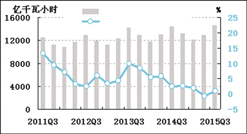 經(jīng)初步季節(jié)調整,三季度發(fā)電量為1.5萬億千瓦小時,同比由上季度下降轉為增長0.9%,同比增速比去年同期下降1.6個百分點。