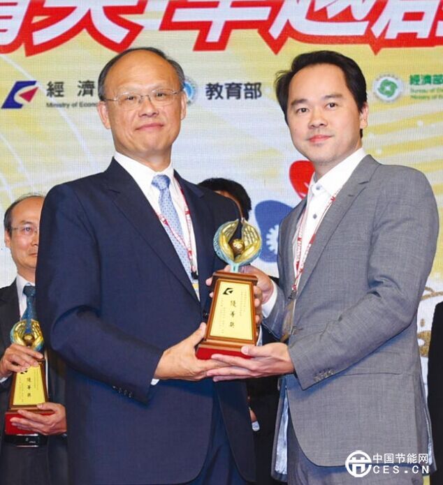 大康織機公司協(xié)理趙國華(右)接受經(jīng)濟部長鄧振中(左)頒發(fā)節(jié)能優(yōu)等獎獎座。圖/業(yè)者提供