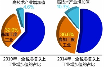 “智造”水平提升全省工業(yè)科技含量。2014年,全省規(guī)模以上高加工度工業(yè)和高技術(shù)產(chǎn)業(yè)增加值,占規(guī)模以上工業(yè)的比重分別為36.6%和10.3%;而2010年,高加工度工業(yè)、高技術(shù)產(chǎn)業(yè)增加值,占規(guī)模工業(yè)增加值的比重僅為32.0%和4.6%。