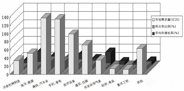 據(jù)行業(yè)統(tǒng)計估算,我國2014年敏感元件與傳感器銷售額突破1200億元;據(jù)預測,2015年需求量可達約652.9億只,增長率高于18%,銷售額將突破1300億元,其產(chǎn)業(yè)輻射和帶動作用較大。目前,我國已有1700余家從事傳感器研制、生產(chǎn)和應用的企事業(yè)單位,傳感器產(chǎn)品達到10大類、42小類、6000多個品種。