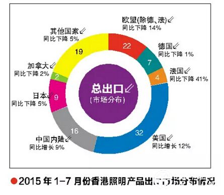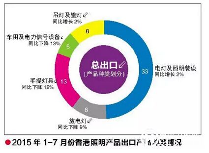 香港出口的照明產(chǎn)品,種類繁多,包括臺燈、床頭燈、座地?zé)艉褪痔釤艟?。其他主要產(chǎn)品尚有壁燈和天花燈、吊燈、照明裝設(shè)以及裝飾燈具,例如圣誕樹用的成套燈飾、燈罩等。2015年1至7月,香港燈飾照明產(chǎn)品總出口按年下跌1%,雖然香港對美國的出口繼續(xù)上升,但對歐盟出口呈現(xiàn)衰退。