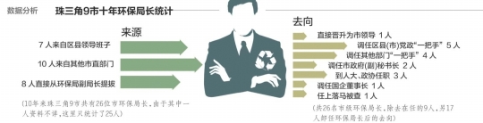 最近10年,珠三角9市環(huán)保局局長進行了1-2輪調(diào)整,個別地方調(diào)整了3輪甚至4輪,在任和離任的環(huán)保局長共有26位。
