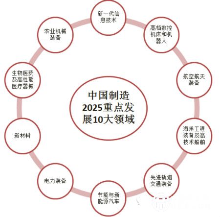 《路線圖》選擇10大優(yōu)勢(shì)和戰(zhàn)略產(chǎn)業(yè)作為突破點(diǎn),分別是新一代信息技術(shù)產(chǎn)業(yè)、高檔數(shù)控機(jī)床和機(jī)器人、航空航天裝備、海洋工程裝備及高技術(shù)船舶、先進(jìn)軌道交通裝備、節(jié)能與新能源汽車、電力裝備、農(nóng)業(yè)裝備、新材料、生物醫(yī)藥及高性能醫(yī)療器械。