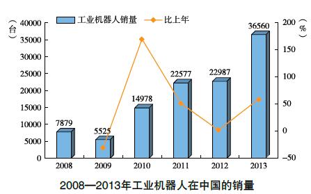 我國從20世紀(jì)70年代開始發(fā)展機(jī)器人,經(jīng)過40年的發(fā)展,主要機(jī)器人產(chǎn)品已實現(xiàn)生產(chǎn),工業(yè)機(jī)器人制造企業(yè)也初具規(guī)模。據(jù)中國機(jī)器人產(chǎn)業(yè)聯(lián)盟統(tǒng)計,2014年,我國工業(yè)機(jī)器人銷量達(dá)5.6萬臺,在2013年就已超過日本成為全球第一大機(jī)器人生產(chǎn)國。從應(yīng)用類型來看,2013年,搬運(yùn)機(jī)器人成為國內(nèi)銷量最多的機(jī)器人,排在第二位的是焊接機(jī)器人,裝備機(jī)器人也呈現(xiàn)快速發(fā)展?!H機(jī)器人聯(lián)合會發(fā)布的報告稱,在今后很長一段時間內(nèi),中國國內(nèi)機(jī)器人需求仍將快速增長,年增長為25%以上,到2017年,中國機(jī)器人市場銷量將達(dá)到10萬臺,中國工業(yè)機(jī)器人保有量將超過40萬臺。2013年,工信部發(fā)布《關(guān)于推進(jìn)工業(yè)機(jī)器人產(chǎn)業(yè)發(fā)展的指導(dǎo)意見》,提出到2020年,須形成完善的工業(yè)型機(jī)器人產(chǎn)業(yè)體系,高端產(chǎn)品市場占有率提高到45%以上,機(jī)器人密度(每萬名員工使用機(jī)器人臺數(shù))由目前的不到30臺提高到100臺以上。