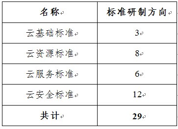 此外,《云計(jì)算綜合標(biāo)準(zhǔn)化體系建設(shè)指南》還公布云計(jì)算29個(gè)重點(diǎn)標(biāo)準(zhǔn)研制方向統(tǒng)計(jì)(如表1)以指導(dǎo)具體標(biāo)準(zhǔn)的立項(xiàng)和制定。對尚未納入標(biāo)準(zhǔn)研制方向但在云計(jì)算綜合標(biāo)準(zhǔn)化體系框架中列出的,統(tǒng)一作為標(biāo)準(zhǔn)化需求研究方向。