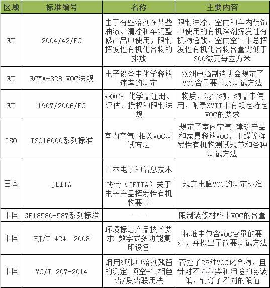 鑒于VOC對人體以及環(huán)境的危害,國際上很多地區(qū)及國家都出臺(tái)了關(guān)于VOC管控的法規(guī)或標(biāo)準(zhǔn),范圍主要涉及建筑材料、室內(nèi)空氣、電子電器等。