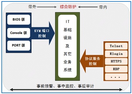 方案中帶內(nèi)帶外運(yùn)維體系相結(jié)合,滿(mǎn)足KVM端口與協(xié)議代理兩種不同的業(yè)務(wù)訪(fǎng)問(wèn)需求,支持運(yùn)維過(guò)程的實(shí)時(shí)監(jiān)測(cè)、管控與審計(jì),從而可實(shí)現(xiàn)“事前風(fēng)險(xiǎn)控制、事中實(shí)時(shí)監(jiān)控、事后審計(jì)追溯”,其訪(fǎng)問(wèn)過(guò)程對(duì)用戶(hù)透明,對(duì)網(wǎng)內(nèi)運(yùn)維操作安全實(shí)施全面防護(hù)模式。