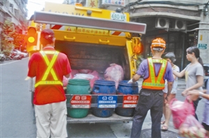 臺(tái)灣新北市街頭定時(shí)定點(diǎn)投放垃圾,臺(tái)灣當(dāng)局的清運(yùn)車輛代表了財(cái)政對(duì)垃圾清運(yùn)的主導(dǎo)作用。