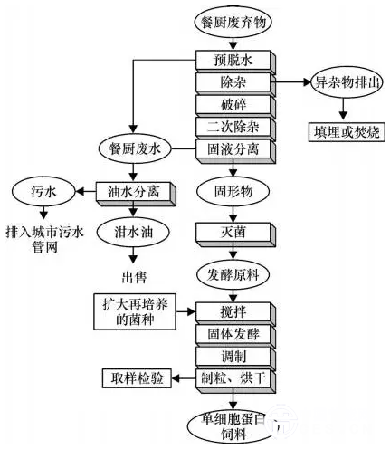 生物法:利用微生物菌體處理餐廚垃圾,利用微生物的生長繁殖和新陳代謝,積累有用的菌體、酶和中間體,經(jīng)烘干后制成蛋白飼料。