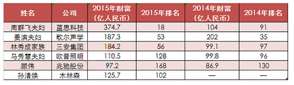 不過,也有三位排名退后了。例如:歐普照明馬秀慧夫婦去年憑借99.8億財富位列第96名,而今年財富微幅增長至110.5億,但排名卻降至第128名。此外,歌爾聲學的姜濱夫婦不但財富縮水、排名也下滑,財富值由去年的202億元人民幣減少至187.3億元人民幣,名次也由35位下滑到53位。另外一位排名跌幅較大的則是兆馳股份有限公司的董事長顧偉,從去年的第130位降至今年的第168位,財富值達97.2億。