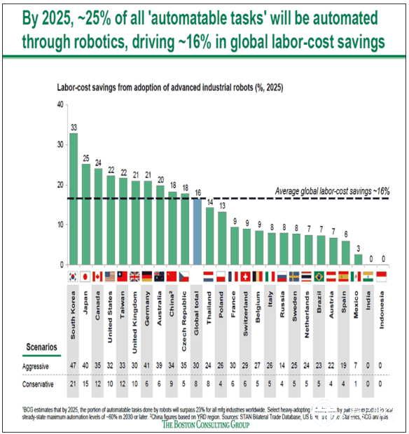 報告說,我們正面臨著生活和工作方式的轉(zhuǎn)變,顛覆性技術(shù)創(chuàng)新的發(fā)展速度將從直線型轉(zhuǎn)變?yōu)閽佄锞€模式。機器人和人工智能已滲透到各行各業(yè),成為了我們?nèi)粘I畋夭豢缮俚牟糠?。任何國家如果不能利用這場機器人革命,其競爭力排名將迅速下滑并被甩到后面。