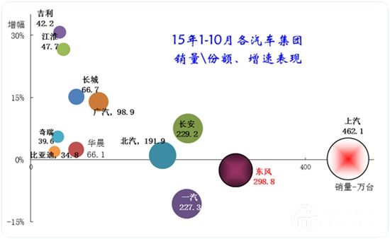 15年1-10月的大集團走勢分化嚴(yán)重,一汽和東風(fēng)嚴(yán)重的負增長,而長安和廣汽表現(xiàn)較好。中小集團中都不錯。一汽和東風(fēng)等大集團因為商用車的比重較大,經(jīng)濟下滑影響卡車表現(xiàn),因此表現(xiàn)稍差可以理解。