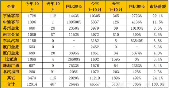 今年1-10月,純電動(dòng)客車(chē)市場(chǎng)前三名仍然是宇通客車(chē)、中通客車(chē)和蘇州金龍海格,累計(jì)產(chǎn)量分別為10305輛、5337輛和3979輛,同比增長(zhǎng)2723%、4136%和10103%(101倍),市場(chǎng)份額為22.1%、11.5%和8.5%。第四名南京金龍累計(jì)產(chǎn)量為3972輛(同比增長(zhǎng)390%),以7輛的微弱差距,屈居海格客車(chē)之后。因此,11月份的市場(chǎng)表現(xiàn),將決定南京金龍與蘇州金龍誰(shuí)能躋身前三甲。