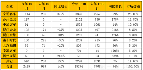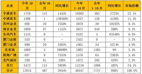 10月份,國內(nèi)混合動(dòng)力客車市場產(chǎn)量為2425輛(含插電式和非插電式),比去年同期的989輛增長145%,1-10月,國內(nèi)混合動(dòng)力客車?yán)塾?jì)產(chǎn)量為15274輛,同比增長74%。雖然月度增幅和累計(jì)增幅都比較大,但凡事都怕比較,一比較就讓人不淡定了:10月份純電動(dòng)客車產(chǎn)量為12814輛,同比增長2644%;1-10月純電動(dòng)客車市場累計(jì)產(chǎn)量達(dá)到46557輛,同比增長806%。這就是說,10月份混合動(dòng)力客車跟純電動(dòng)客車的單月產(chǎn)量差距超過1萬輛,增幅差了18倍,混合動(dòng)力月產(chǎn)量僅為純電動(dòng)客車的19%;1-10月的混合動(dòng)力客車?yán)塾?jì)產(chǎn)量跟純電動(dòng)客車相比,差了3.1萬輛,增幅差了11倍!真可謂是,越到年底,反差越大。在國家大力支持純電方向和純電動(dòng)客車30-50萬/輛的中央財(cái)政補(bǔ)貼政策下,各地政府和企事業(yè)單位為了完成考核任務(wù),或者拿到高額補(bǔ)貼,把主要精力都集中在純電動(dòng)客車領(lǐng)域,混合動(dòng)力相對(duì)而言不受關(guān)注和青睞,也在情理之中。