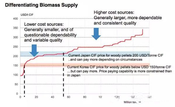 Matt Bovelander指出,日本公用事業(yè)處于有利地位去尋找大量的優(yōu)質(zhì)生物質(zhì),保證了長期供貨合同。FIT滿足日本的價格支付能力。一般來說,他們能付得起200-220美元每噸顆粒的到岸價。