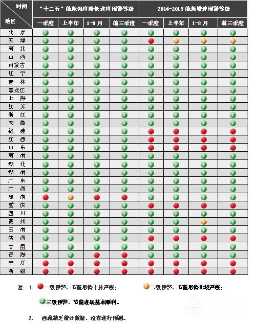 通過對各地區(qū)節(jié)能形勢進(jìn)行分析,對照“十二五”節(jié)能工作進(jìn)度要求,今年前三季度,海南、青海、寧夏、新疆等4個(gè)地區(qū)預(yù)警等級為一級,節(jié)能形勢十分嚴(yán)峻;北京、天津、河北、山西、內(nèi)蒙古、遼寧、吉林、黑龍江、上海、江蘇、浙江、安徽、福建、江西、山東、河南、湖北、湖南、廣東、廣西、重慶、四川、貴州、云南、陜西、甘肅等26個(gè)地區(qū)預(yù)警等級為三級,節(jié)能工作進(jìn)展基本順利。