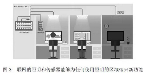 在PoE配置中,每個(gè)LED燈具可為標(biāo)準(zhǔn)RJ45連接器即插即用設(shè)備,自身擁有IP地址,可獨(dú)立尋址。通過PoE連接智能LED集中器(集成傳感器和無線訪問點(diǎn)),可為發(fā)光的每個(gè)LED集中器供電。PoE連接也支持每個(gè)LED集中器從各種傳感器收集信息,并將數(shù)據(jù)送回至控制器(如圖3所示),收集的信息可能包括環(huán)境光、溫度、濕度以及匿名的房間使用率數(shù)據(jù)。例如,感應(yīng)傳感器可用于確保只在有人進(jìn)入房間時(shí)才打開照明燈,當(dāng)傳感器檢測不到任何人存在時(shí),自動(dòng)關(guān)閉照明。或者,環(huán)境光傳感器支持日光收集,因?yàn)長ED照明在日光不足時(shí)自動(dòng)調(diào)節(jié),以維持照明。